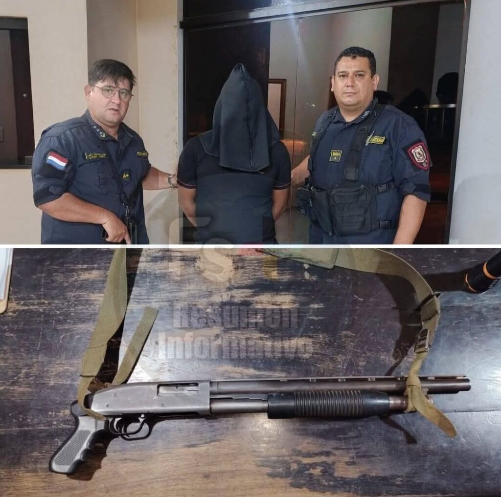 Los intervinientes realizaron un rastrillaje por la zona, logrando ubicar y aprehender a Aranda Morínigo, domiciliado en la ciudad de Bella Vista. En su poder fue incautada una escopeta recortada calibre 12 mm, marca Warnig, modelo USA78863, presumiblemente utilizada en el hecho.